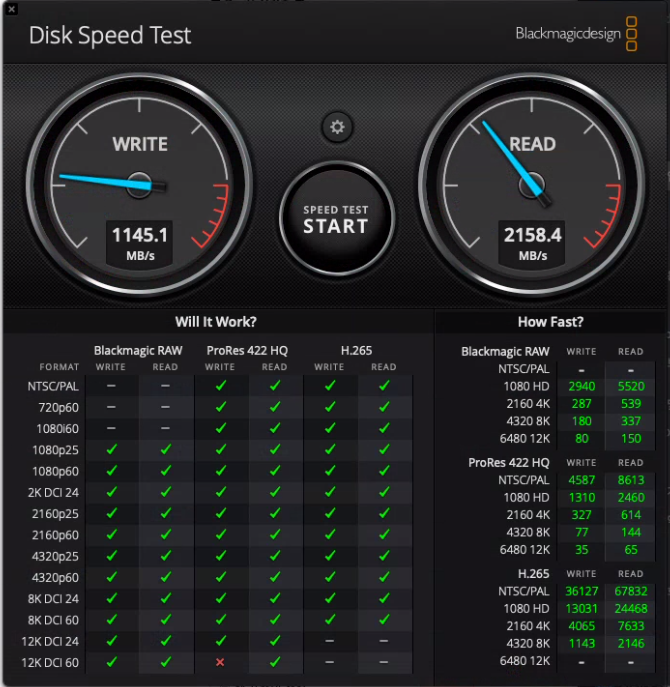 속도측정을 위해서 Disk Speed Test 를 돌려보았습니다. 5기가 데이타로 측정했는데 읽기/쓰기 각각 2158MB/1145MB 로 매우 만족스러운 속도입니다. 제품 설명에 명시된 속도는 2300MB/s read speed ; 1400MB/s write speed 이렇게 되어 있는데 그 수준의 80% 정도를 보여주고 있네요.