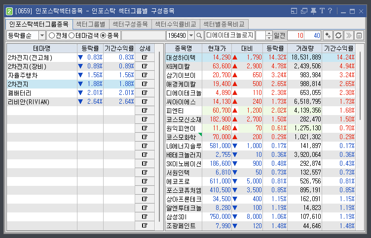 인포스탁섹터를 통해 확인해보니 2차전지 전고체, 장비 그리고 자유주행과 폐배터리에 리비안까지 엮여있는듯 합니다. 로봇 테마 쪽은 안보이는데 곧 업데이트 되겠죠..?