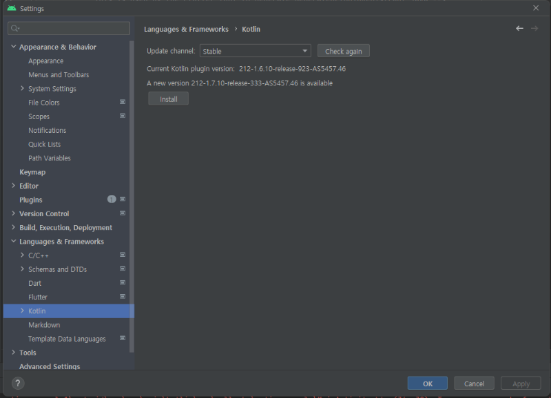 File - Settings 셋팅창을 띄운 뒤 Languages & Frameworks 아래에 Kotlin 을 눌러보시면 Kotlin 버전을 확인하실수 있습니다. 제 현재 코틀린 버전은 1.6.10 으로 나와 있어서 이 버전으로 변경해줍니다.