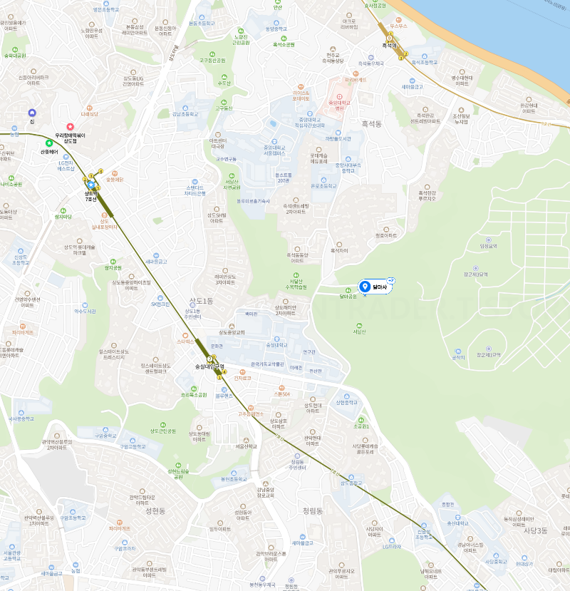 지도로 보면 숭실대입구와 그리 멀지 않은 곳에 있어서 두다리가 튼튼하다면 걸어서도 갈 수 있습니다. 저는 마을버스를 타고 접근해보았는데 버스에서 내려 사찰에 도착해보니 두다리가 힘들어하고 있어서 트래킹으로 도착하기엔 힘들듯 합니다.
