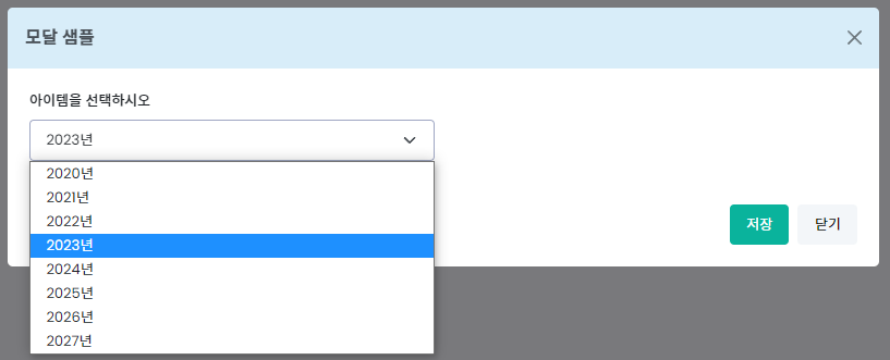 다음과 같은 modal 레이어를 하나 작성하고 그 안에 select 박스를 그려주었습니다. select 박스가 가지는 옵션은 년도 데이타를 가집니다. 데이타가 많아질 경우 검색 기능이 필요하므로 select2 를 적용해줍니다.