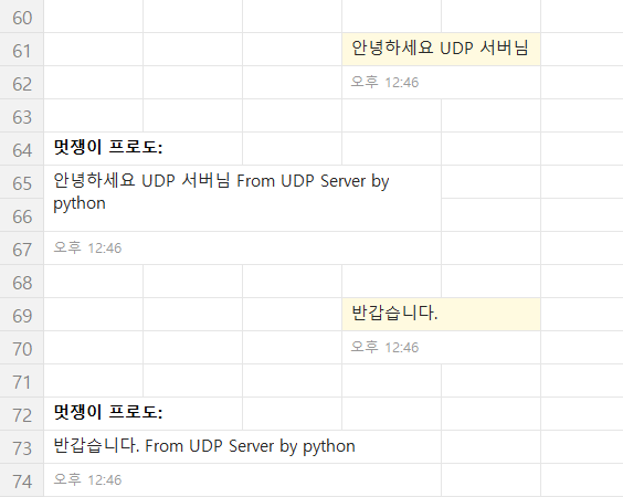 이렇게 작성된 코드로 카카오봇과의 대화를 시도해보았습니다. 제가 전송한 대화의 뒤에 From UDP Server by python 텍스트를 넣고 응답을 하고 있습니다.