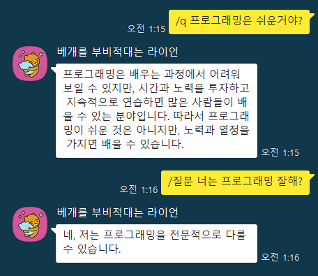 카톡 채팅창에서 /q '질문내용' or /질문 '질문내용' 과 같은 형식으로 chatGPT에게 질문을 하고 응답을 받는 방식을 취했습니다.