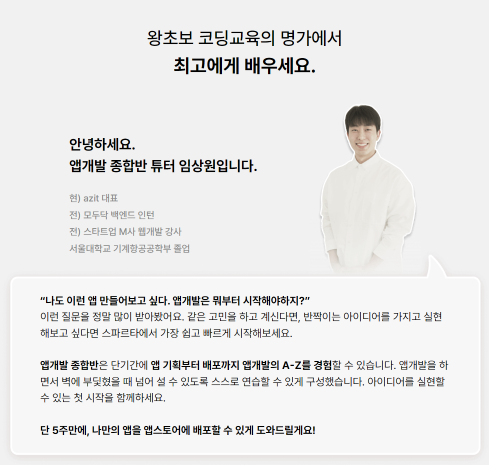 5월 22일 이전에 알아보고 수강신청을 했던터라 현재는 해당 수강 정보를 확인하기가 어려운데 당시 눈에 띄는건 스파르타코딩클럽, 그리고 패스트컴퍼스에 있는 flutter 강의 2개였습니다.