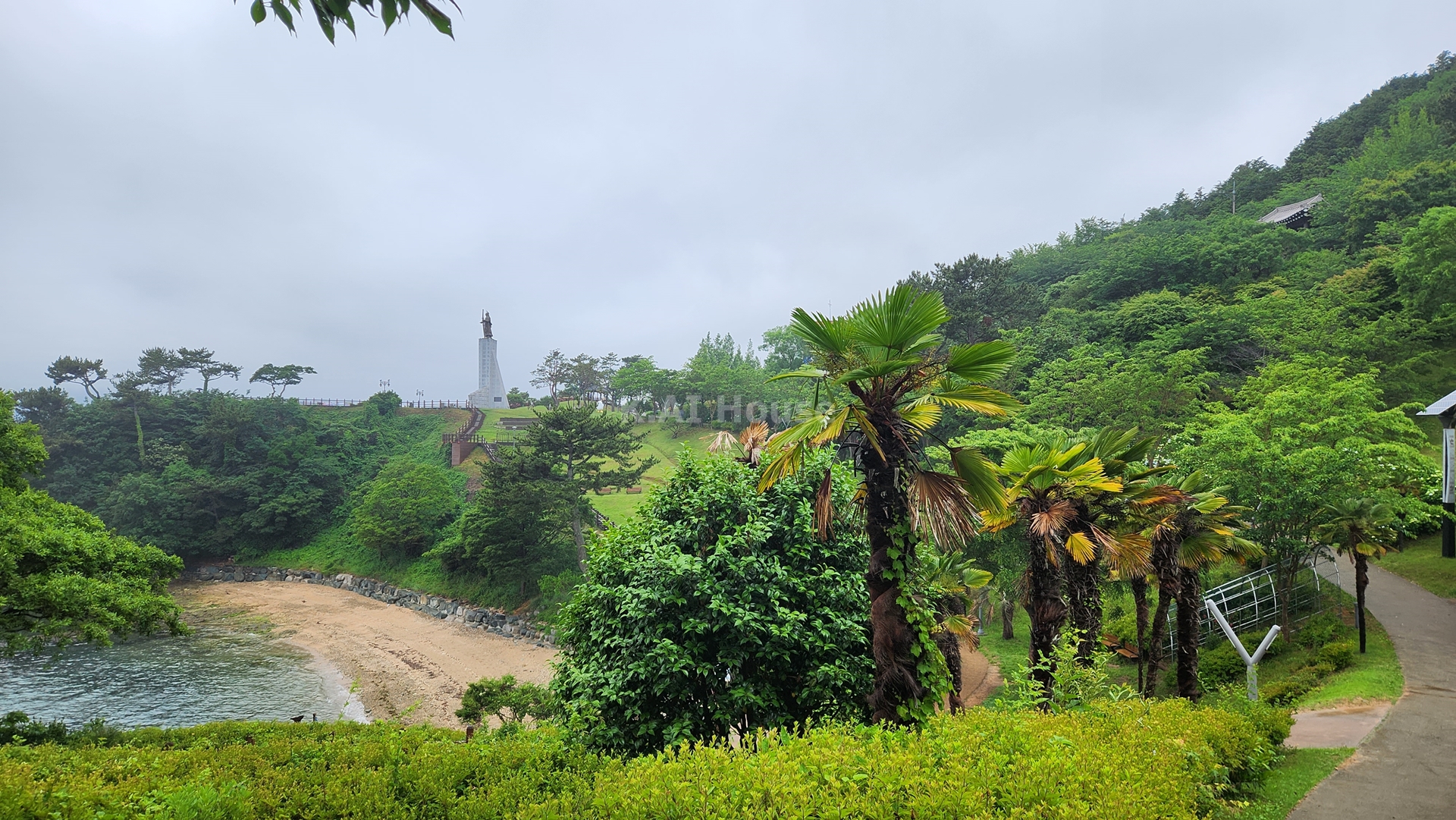 저 멀리 우리가 처음 마주했던 이순신 동상이 보입니다. 해변에 가까이 다가온 김에 해변을 끼고 걸었습니다. 아까와는 다르게 돌아가는 동안에는 비바람이 약해져서 계단으로 오르기로 합니다. 날씨가 참 아쉬웠습니다.