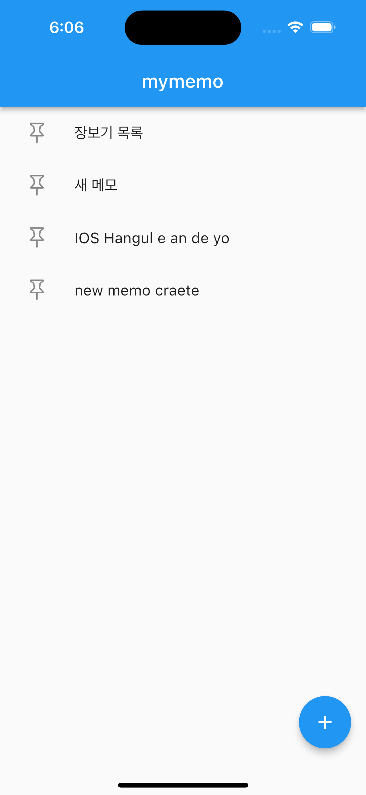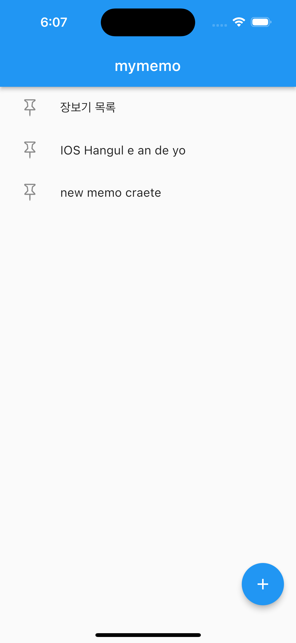 아직 다 개발된건 아니지만 3주차 진행하던 부분까지 완성된 메모장앱 화면입니다.