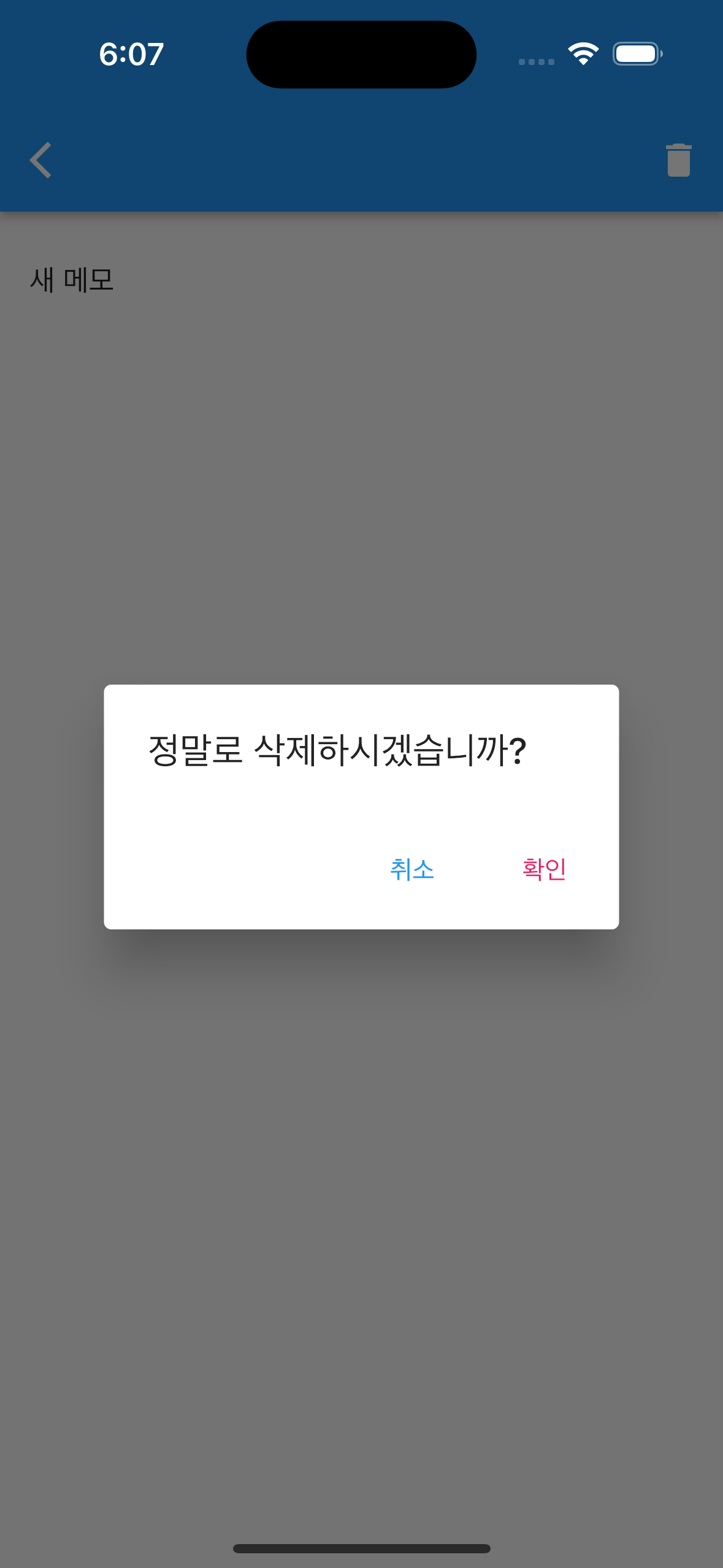 우측 상단의 휴지통 버튼을 누르면 삭제하겠냐는 메시지와 함께 메모를 삭제하고 네비게이터 pop을 수행하면서 리스트 화면으로 넘어갑니다.