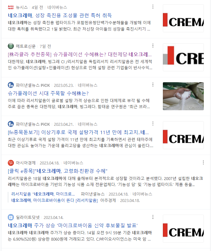 슈가플레이션 수혜주, 설탕 가격 11년만에 최고치, 고령화 친환경 수혜, 마이크로바이옴 신약 관련 뉴스가 나열되어 있습니다. 꾸준히 뉴스가 나오는 것을 보면 주가부양을 위해 언론에 회사를 자주 소개하고 있는 것으로 확인됩니다.