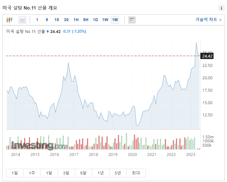 설탕 선물 가격이 10년 고가를 갱신했다는 얘기를 들었습니다. 설탕 가격 고가 + 슈가플레이션이라는 키워드를 가지고 있더군요.