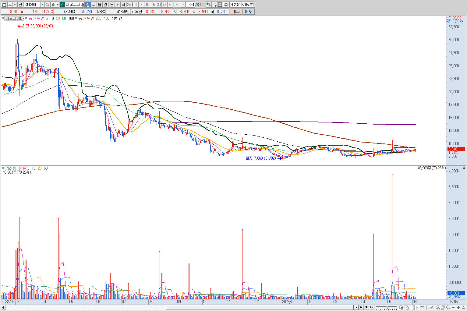 네오크레마는 2022년 3월에 고점을 찍고 제대로 된 반등한번 없이 추세를 타고 내려와서 바닥을 형성하고 있는 중입니다.