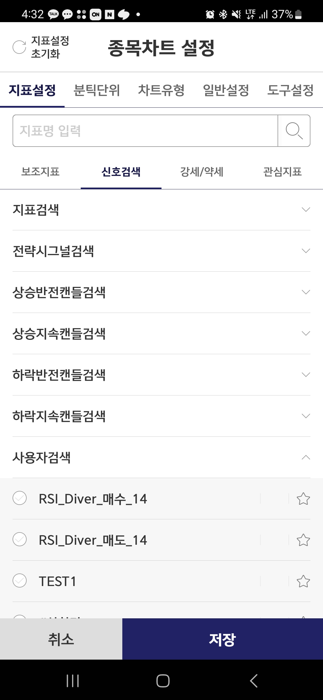 지표설정의 보조지표/신호검색/강세약세 각 탭에서 내려받은 사용자지표를 확인할 수 있으며 우측 별표시를 통해 관심지표로 등록해두시면 차트 지표 선택시 관심지표 속에서 쉽게 선택해서 차트에 적용이 가능합니다.