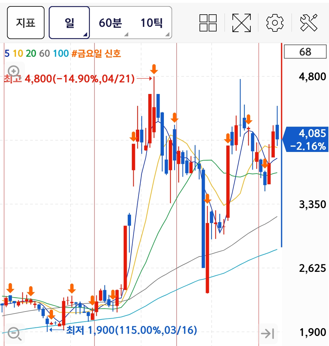 금요일 마다 화살표 매도 신호를 잡아두었는데 한주가 끝나는 것을 만드는게 목적이었으나 금요일이 공휴일이면 목요일에 체크가 되어야 하는데 거기까지는 만들지 못한 수식이네요.