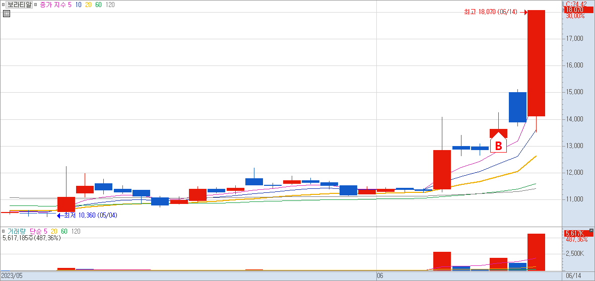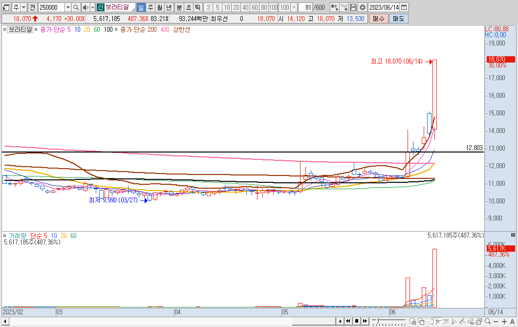 보라티알은 신송홀딩스와 마찬가지로 오염수 방류 이슈로 소금 테마가 강하게 형성된 종목들 중 하나입니다. 소금 관련 테마 종목에 대상홀딩스, 대봉엘에스, 인산가도 있지만 매매는 하지 않았습니다.