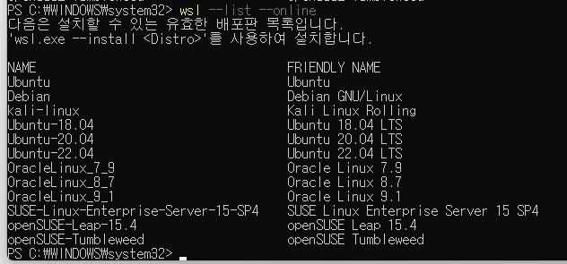 먼저 아래 명령어를 통해 WSL로 설치 가능한 리눅스 종류를 확인해봅니다.