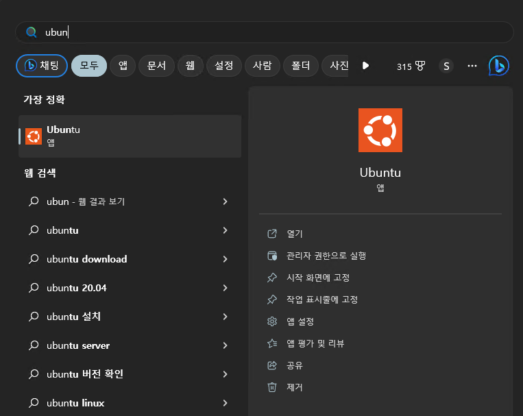 또는 윈도우 검색창에 ubuntu 를 입력해보면 아래와 같이 Ubuntu 앱을 볼 수 있습니다. 이 아이콘을 클릭해서도 접속이 가능합니다.