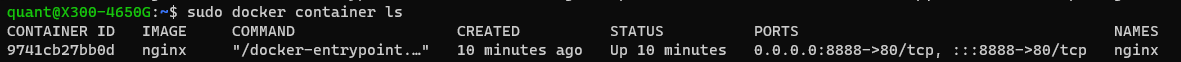 9741cb27bb0d nginx "/docker-entrypoint.…" 10 minutes ago Up 10 minutes 0.0.0.0:8888->80/tcp, :::8888->80/tcp nginx