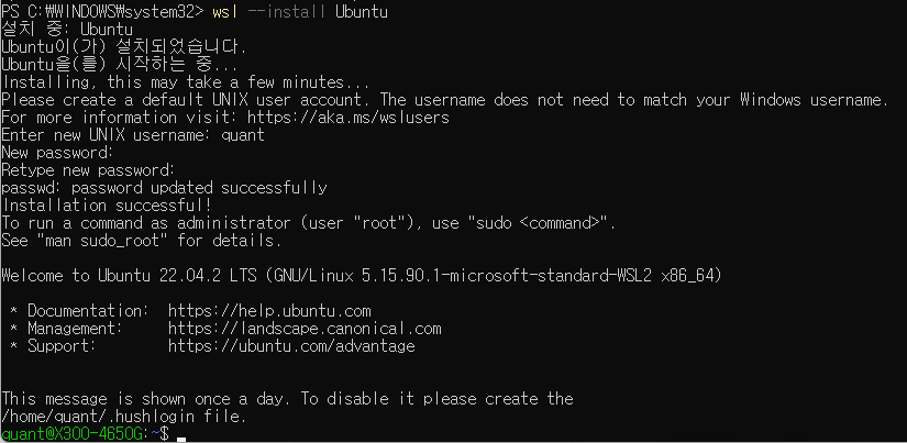 위 문서를 통해 윈도우11 환경에서 WSL 설치를 마무리했습니다.