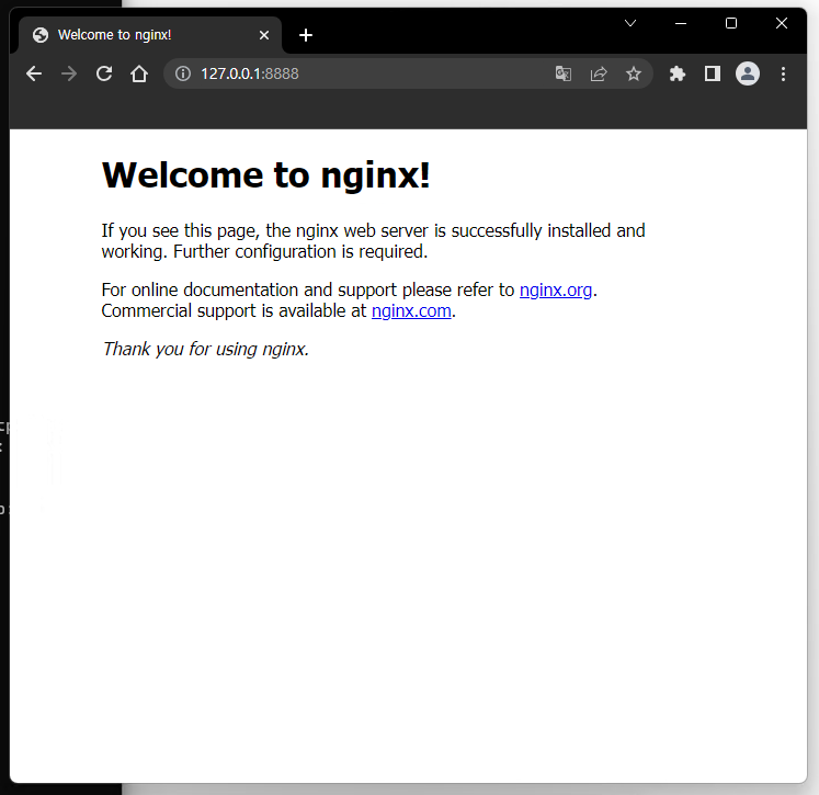 브라우저를 띄워 localhost 에 8888 포트로 접근해보면 접속되면서 nginx 환영 메시지가 출력되는 것을 보실수 있습니다.