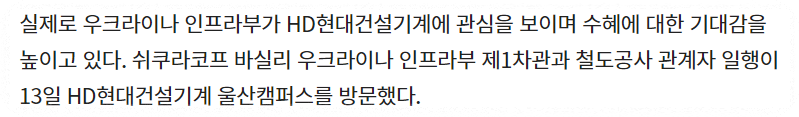 뉴스에는 우크라이나 인프라부 제1차관과 철동공사 관계자 일행이 HD현대건설기계 울산캠퍼스를 방문했다면서 HD현대건설기계가 수혜를 볼것으로 추측하고 있습니다.