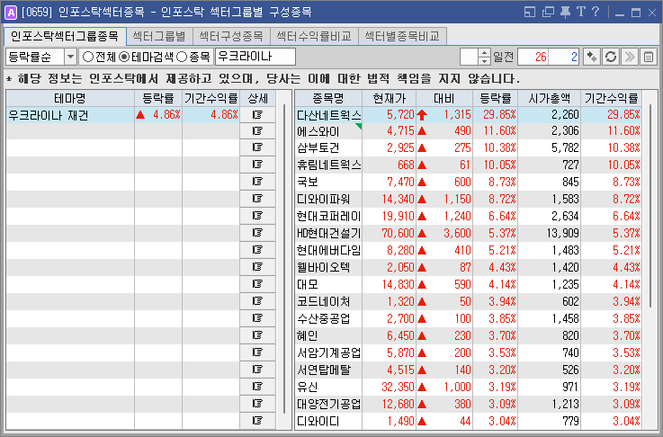 인포스탁섹터종목 정보를 통해 우크라이나 재건 섹터 종목들을 확인해보았습니다.