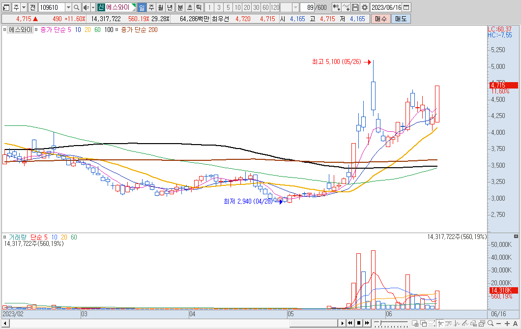 근래 저항으로 작용하던 60선 돌파 이후 시원한 단기 상승을 보여준 에스와이입니다. 현재 10선은 계속 이탈시키고 있고 20선을 위협하고 있는 자리에서 상승이 나와주었습니다. 20선 이탈 시 정리하고 다시 봐야 하는 관점입니다. 천천히 갈지 빨리 갈지는 잘 모르겠으나 재료관점이 살아 있으니 관심을 가져보려 합니다.