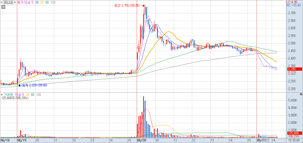 19일자에는 너무 많은 종목이 검색되어서 분간이 힘들었고 20일자에는 적은 종목이 검색되어 하나씩 분석해볼 수 있었는데 유니슨과 서희건설이 시가베팅 후보 대상으로 정했습니다.