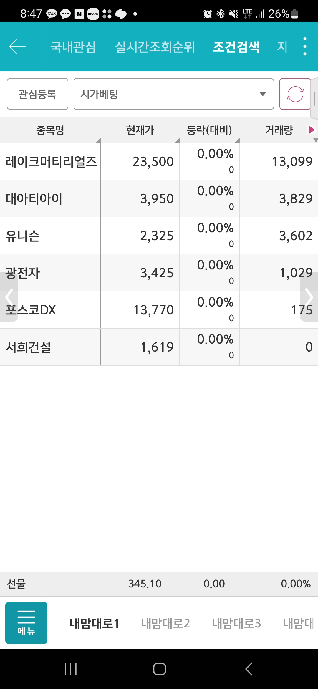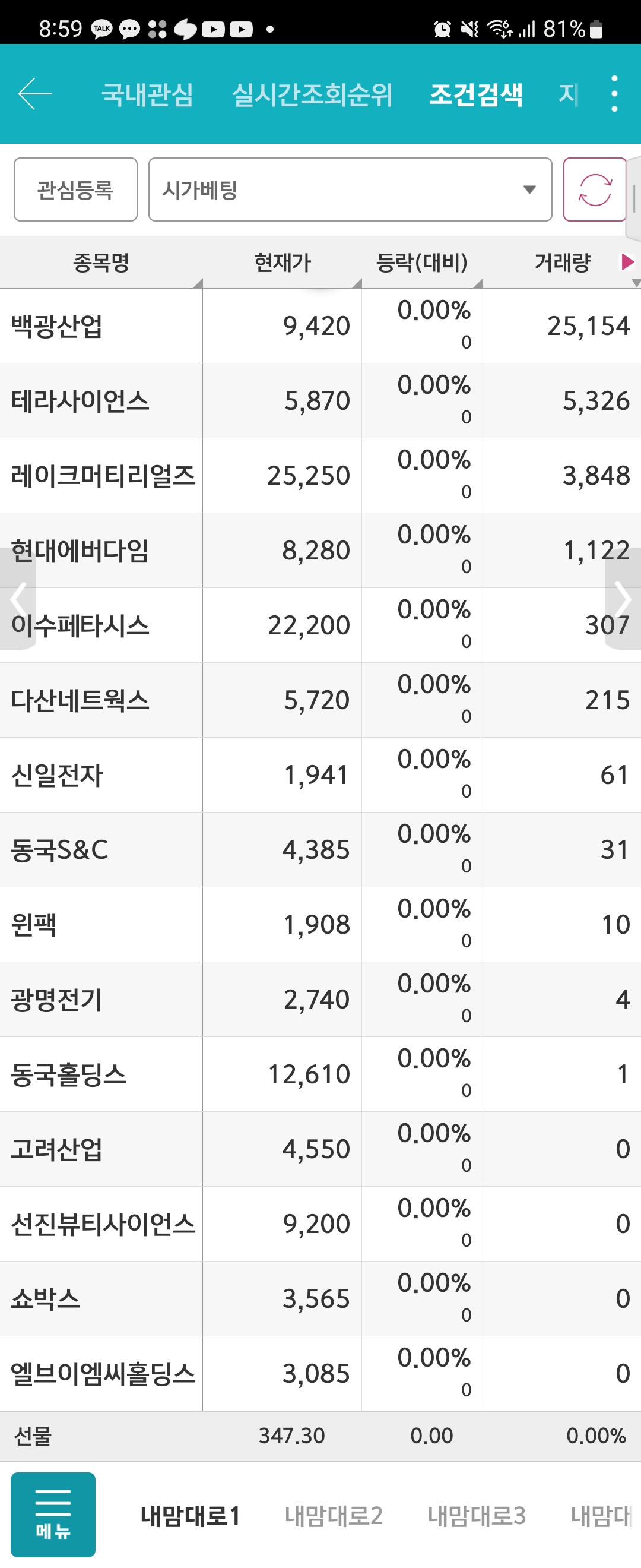 장 시작전 8시 40분부터 9시 사이에 많은 종목이 검색되지만 8시 55분 즈음해서 집중적으로 보는 편입니다.