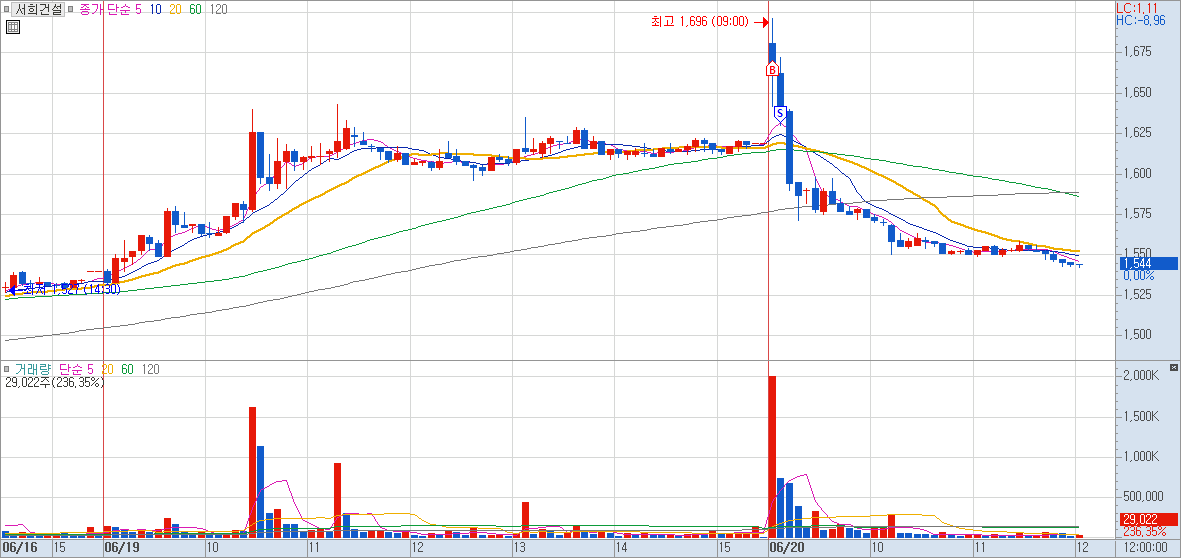 먼저 서희건설에 진입했으나 손절이 나갔습니다. 분봉 거래가 크게 터지고 내리는 모습이 강해보여 일단 손절 정리를 하고 나중에 다시보자라는 마음이었습니다. 결과론적으로 손절은 잘한걸로 판단합니다.
