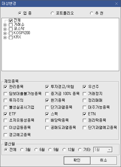 그리고 기본대상 설정한 부분도 동일하게 체크해주시면 됩니다. 환기종목이나 투자주의 등의 설정도 본인 기준에 맞게 변경해서 사용하시면 됩니다.