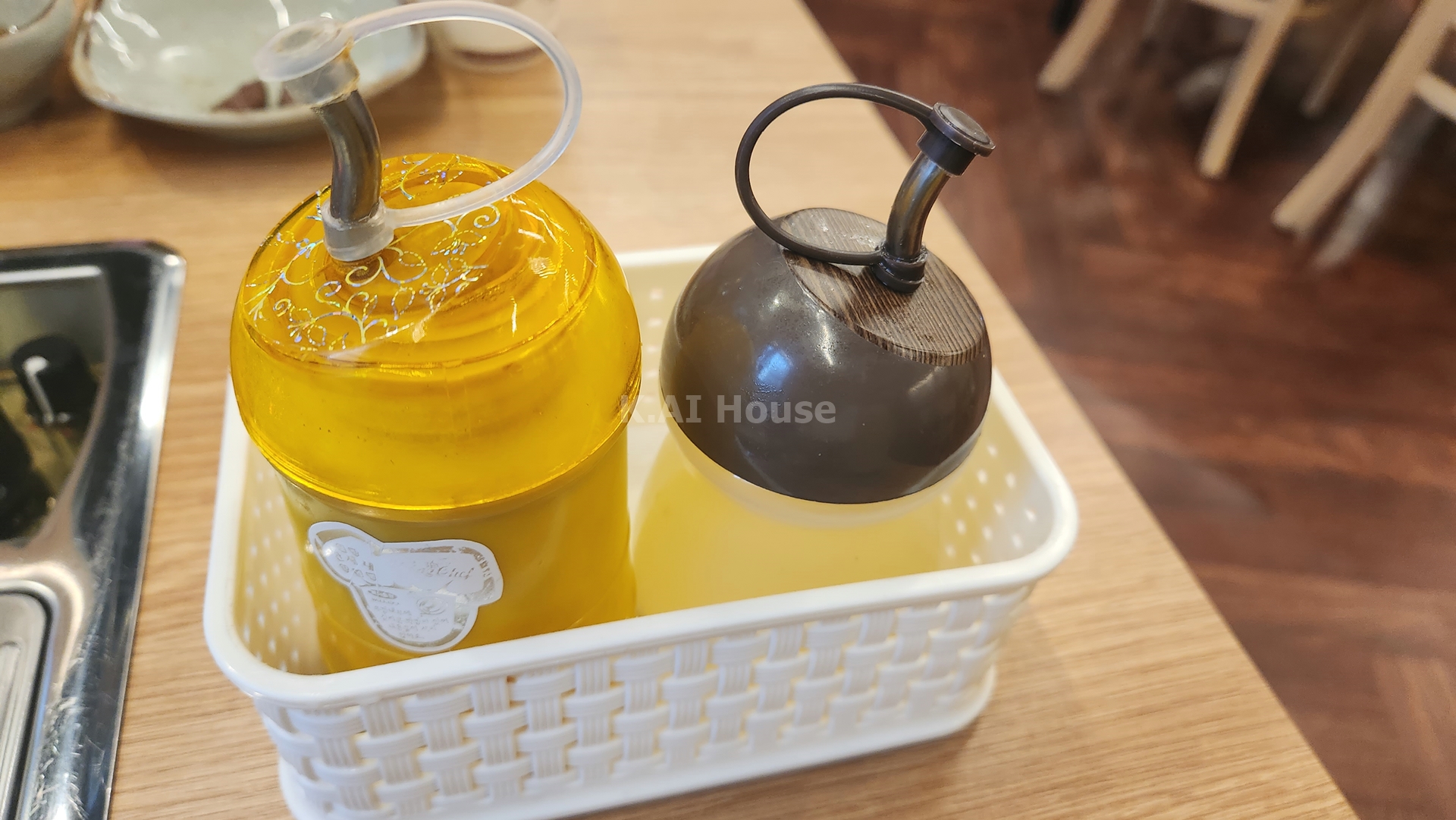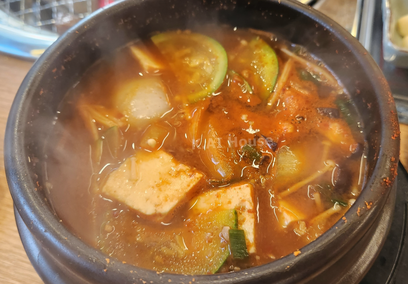아이가 먹을 수 있게 된장찌개와 공기밥도 주문했는데 된장찌개는 기본이 약간 매콤한 구성이라 하십니다. 매운 양념을 뺄 수 없냐 물었으나 숙성된 양념장으로 미리 준비된 부분이어서 어렵다는 답변을 듣고 물을 조금 타서 섞어 주자는 생각으로 주문하게 됩니다.