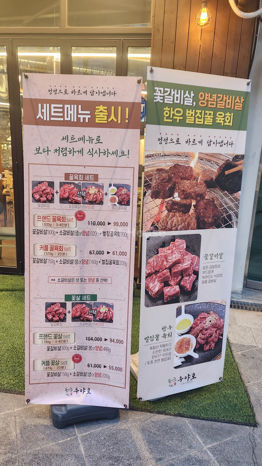 우야호 간판메뉴 꽃갈비살이 할인 중입니다. 소갈비살도 먹어보고 싶고 꿀육회도 먹어보고 싶었으나 입짧은 가족 구성원인지라 꽃갈비살과 소갈비살 조합으로 되어 있는 커플 꽃살 set 를 주문합니다. 소갈비살은 생갈비와 양념갈비 중에서 선택이 가능해 생갈비로 선택했습니다.