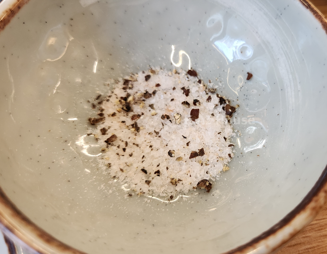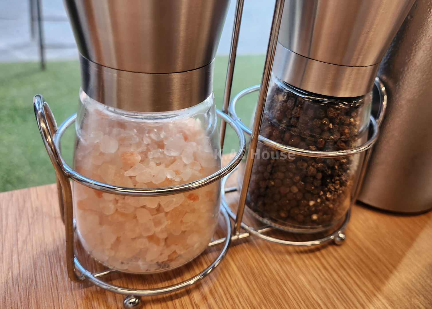 소고기 찍어먹는 소금이 옆에 있습니다. 히말라야 핑크 솔트로 알려진 그 소금입니다.  원전오염수 이슈가 있는데 히말라야 소금이니 안심하고 먹을 수 있습니다. 직접 갈아서 종지에 붓고 옆에 후추도 필요한 만큼 직접 갈아서 본인 취향에 맛는 조합으로 만드셔서 찍어 드시면 됩니다.