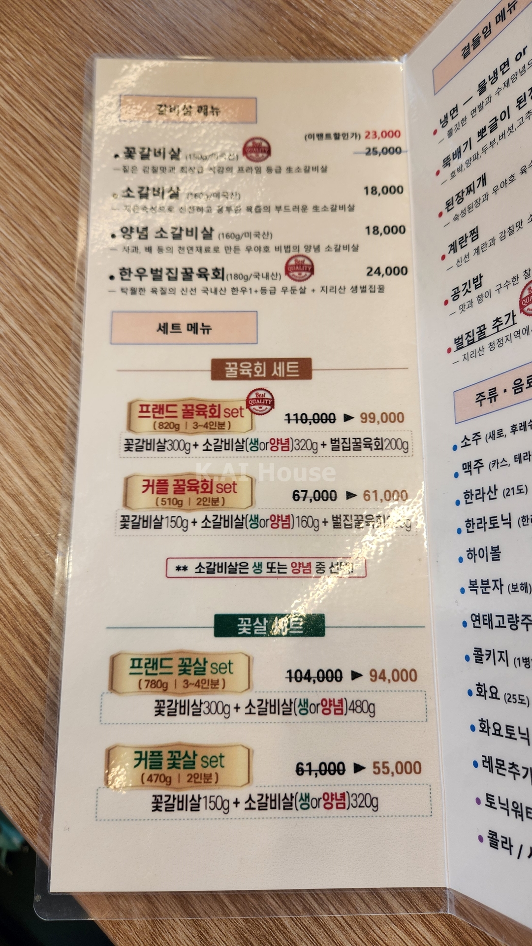 우야호 간판메뉴 꽃갈비살이 할인 중입니다. 소갈비살도 먹어보고 싶고 꿀육회도 먹어보고 싶었으나 입짧은 가족 구성원인지라 꽃갈비살과 소갈비살 조합으로 되어 있는 커플 꽃살 set 를 주문합니다. 소갈비살은 생갈비와 양념갈비 중에서 선택이 가능해 생갈비로 선택했습니다.
