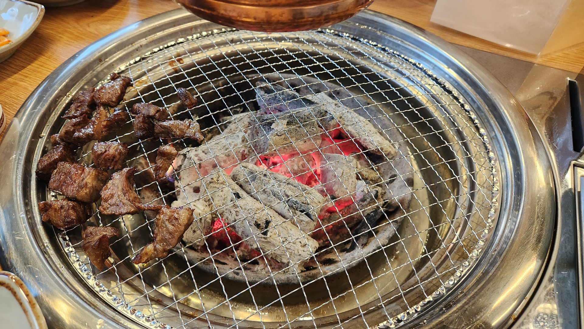 준비된 숯불위에 꽃갈비살과 소갈비살을 올려줍니다. 노릇노릇 잘익어갑니다.