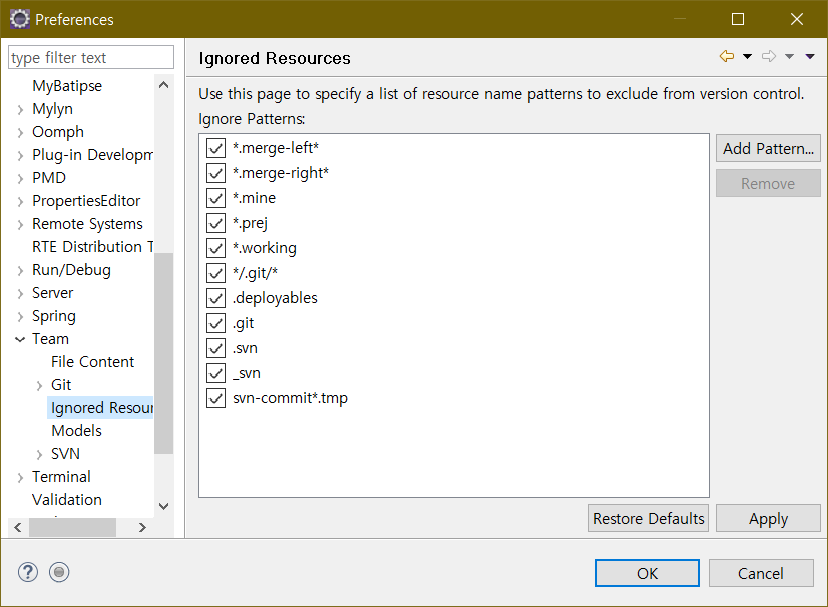 리소스 검색 시 target 폴더를 제외하는 것은 프로젝트마다 설정하게 되어 있었는데 다행히 svn commit 시 target 폴더 제외 시키는 건 이클립스 전체 공통 셋팅에 해당하기 때문에 아래 과정을 한번만 진행해주면 됩니다.