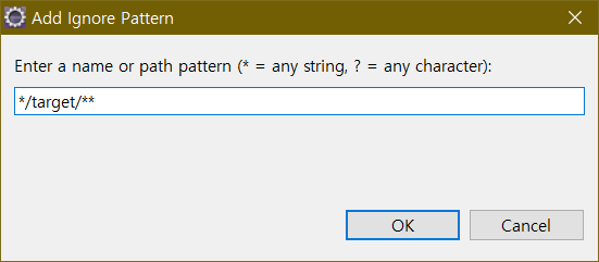 위처럼 진행해주시면 Ignore Patterns 항목에서 target 항목이 보이실텐데 이렇게 설정후 OK 버튼을 눌러 적용해줍니다.