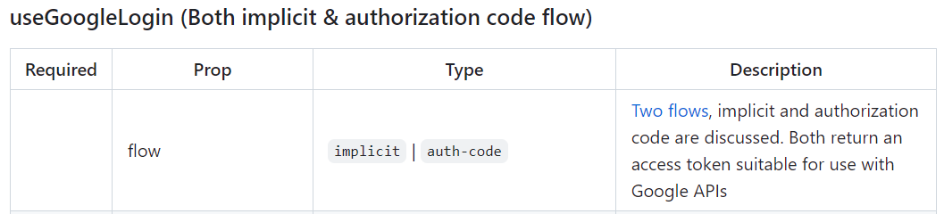 커스텀 버튼은 useGoogleLogin 함수를 이용해야 하며 인증방식에 있어서 auth_code 와 implicit 두가지를 제공해줍니다.