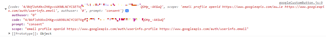 auth_code 방식으로 인증 성공시 반환되는 데이터를 console 에 찍어보았습니다. 발급되는 code 값을 서버로 보내 서버단에서 액세스토큰을 발급하는 방식이어서 보안성이 올라갑니다.