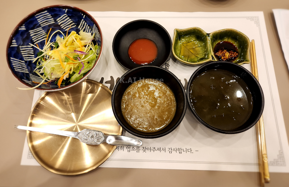 샐러드와 죽, 그리고 미역국이 먼저 제공됩니다. 식전에 배를 달래주는 목적이고 메인을 많이 먹기 위해 배부르게 먹지 않았습니다.