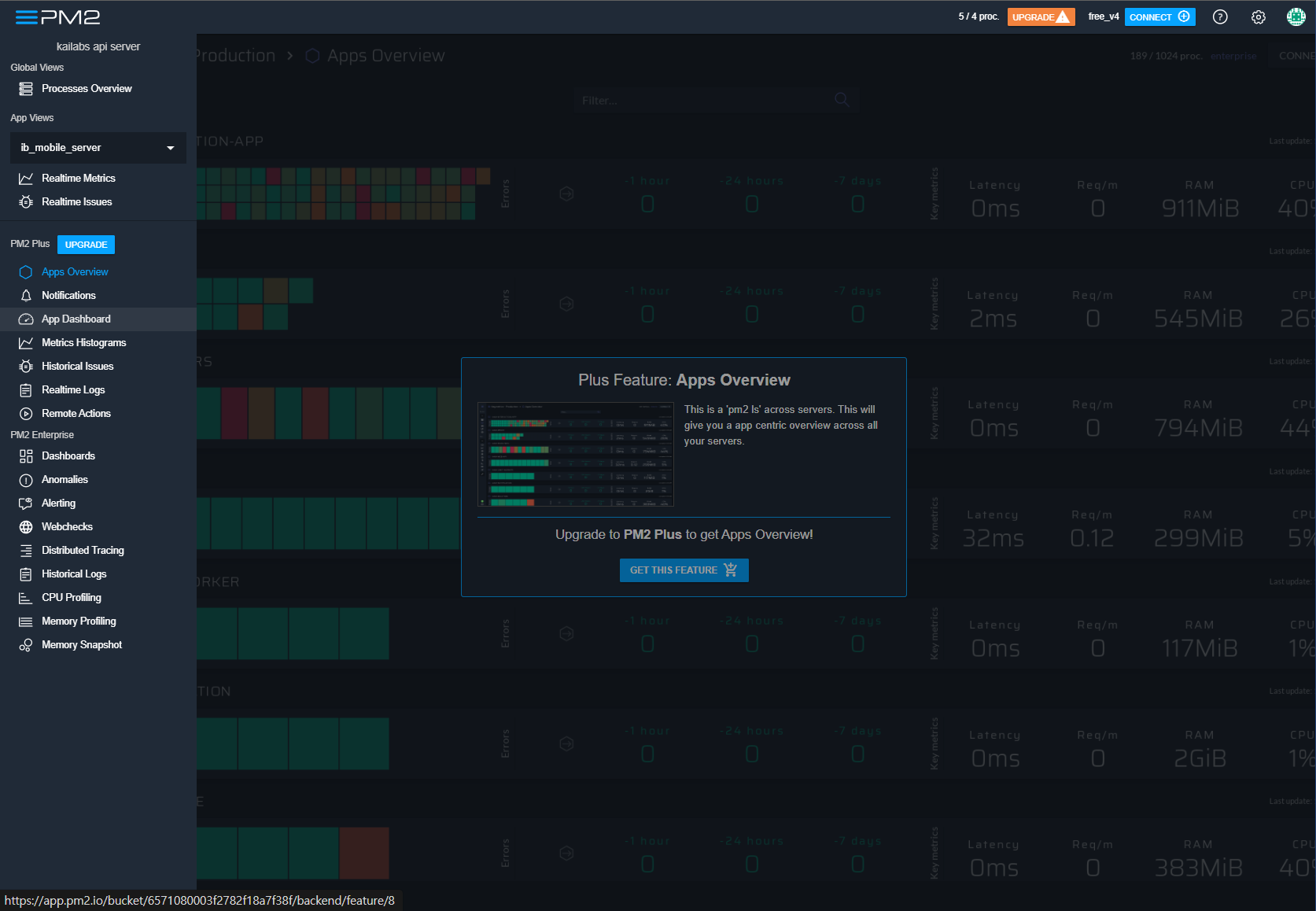 기본적으로 PM2 모니터링은 서비스는 무료입니다만 더 많은 기능을 제공해주는 프리미엄 구독 서비스도 존재합니다.