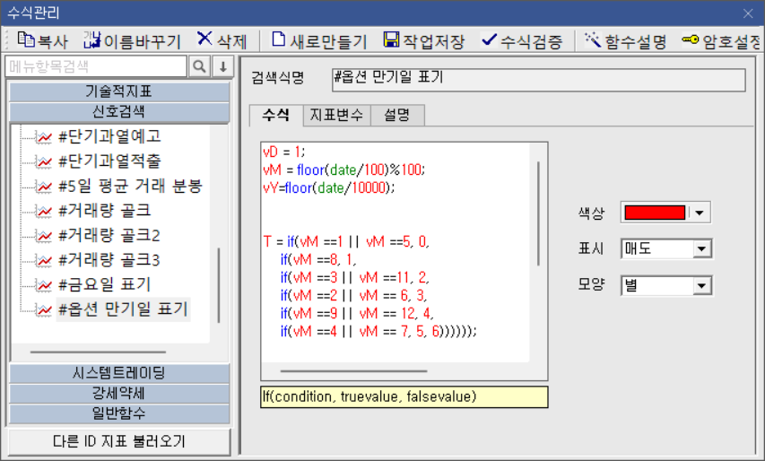 옵션만기일을 표기하기 위해서 수식을 작성해야 하는데 신호검색의 사용자지표에서 작성해야 합니다.