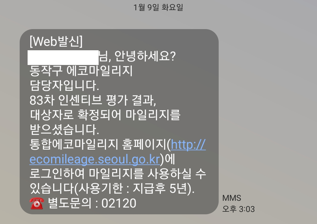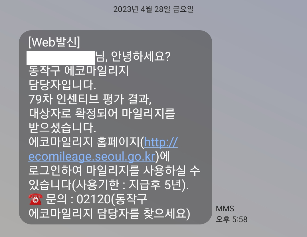 문자메시지함을 보던중 동작구 에코마일리지에서 온 문자를 보게 되었습니다.