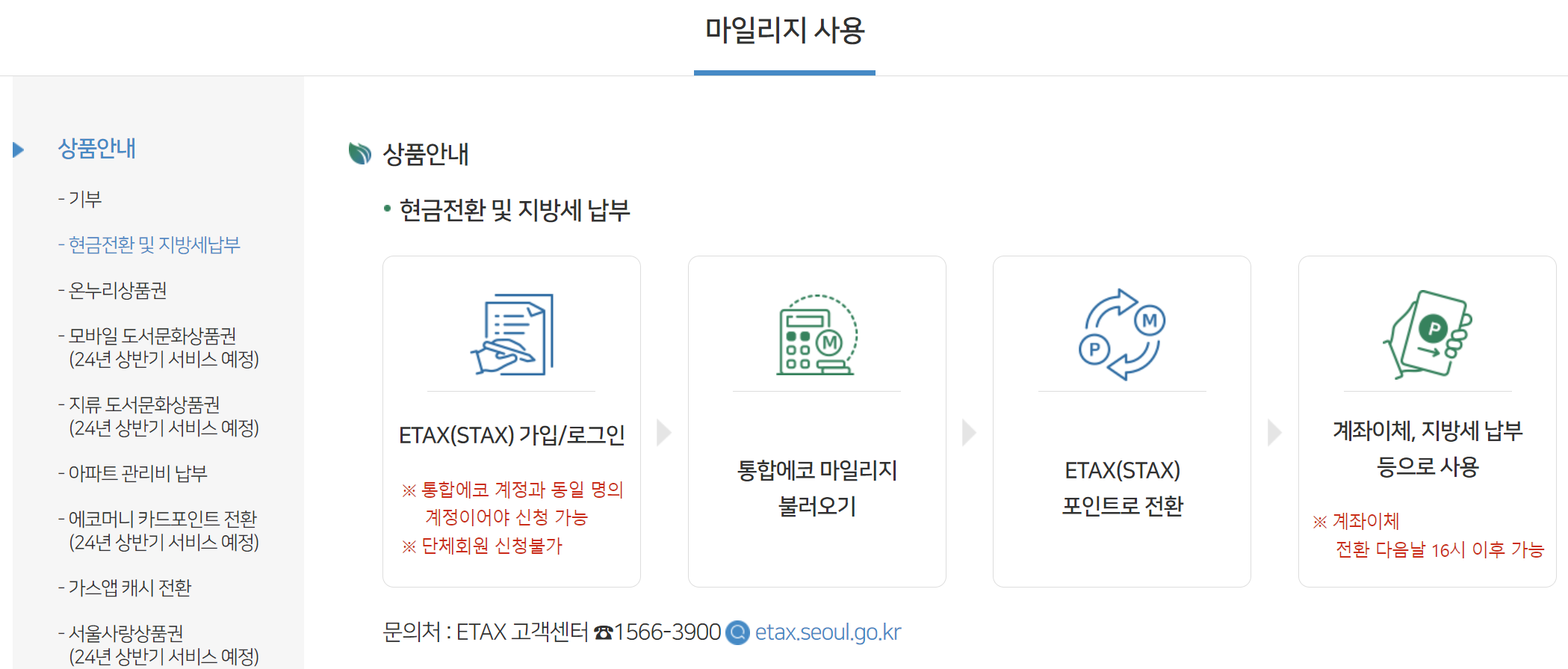 해당 마일리지는 상품권, 현금전환, ETAX에서 세금납부 등 다양한 방식으로 사용이 가능한데요. 가스앱 캐시로 전환해서 도시가스 요금으로도 낼수 있는 방식이 추가되었습니다.
