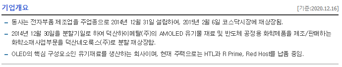 덕산네오룩스 기업개요를 보면 알수 있듯이 OLED 핵심 구성요소인 유기재료를 생산하는 회사입니다.