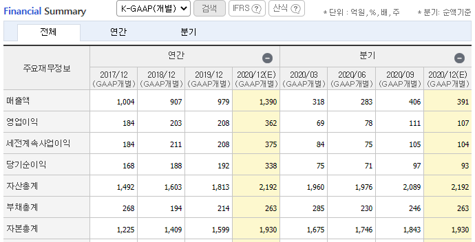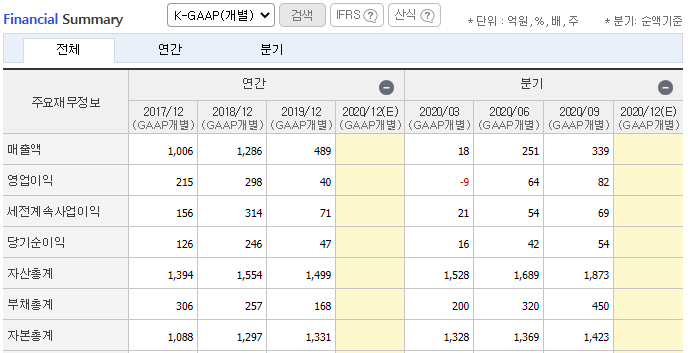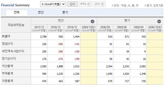 재무를 확인해보니 2020년 실적이 흑자전환이 기대되는 상황입니다.