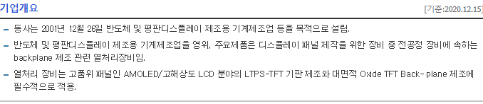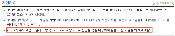 기업개요를 확인해보니 OLED 주력제품이 플렉서블 방식에 대응해 필름 커팅 기술을 최초로 개발했다고 합니다.