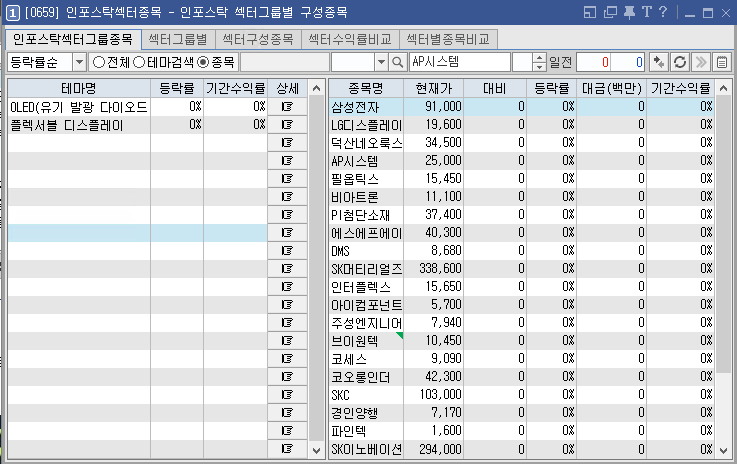 인포스탁섹터 통해 확인한바 롤러블디스플레이 섹터는 보이지 않아서 플렉서블 디스플레이, 그리고 OLED 섹터를 확인해보았고 두 섹터 모두 겹치는 종목으로 관련주를 뽑아보았습니다.