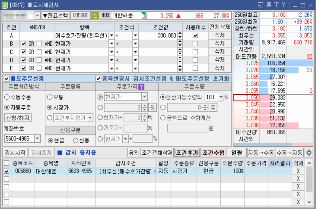 그래서 매수잔량을 추적하는 방식으로 영웅문 0317 화면 매도시세감시를 통해 호가잔량 변경시 자동으로 매도하게 되는 전략을 찾게 되었다고 합니다.