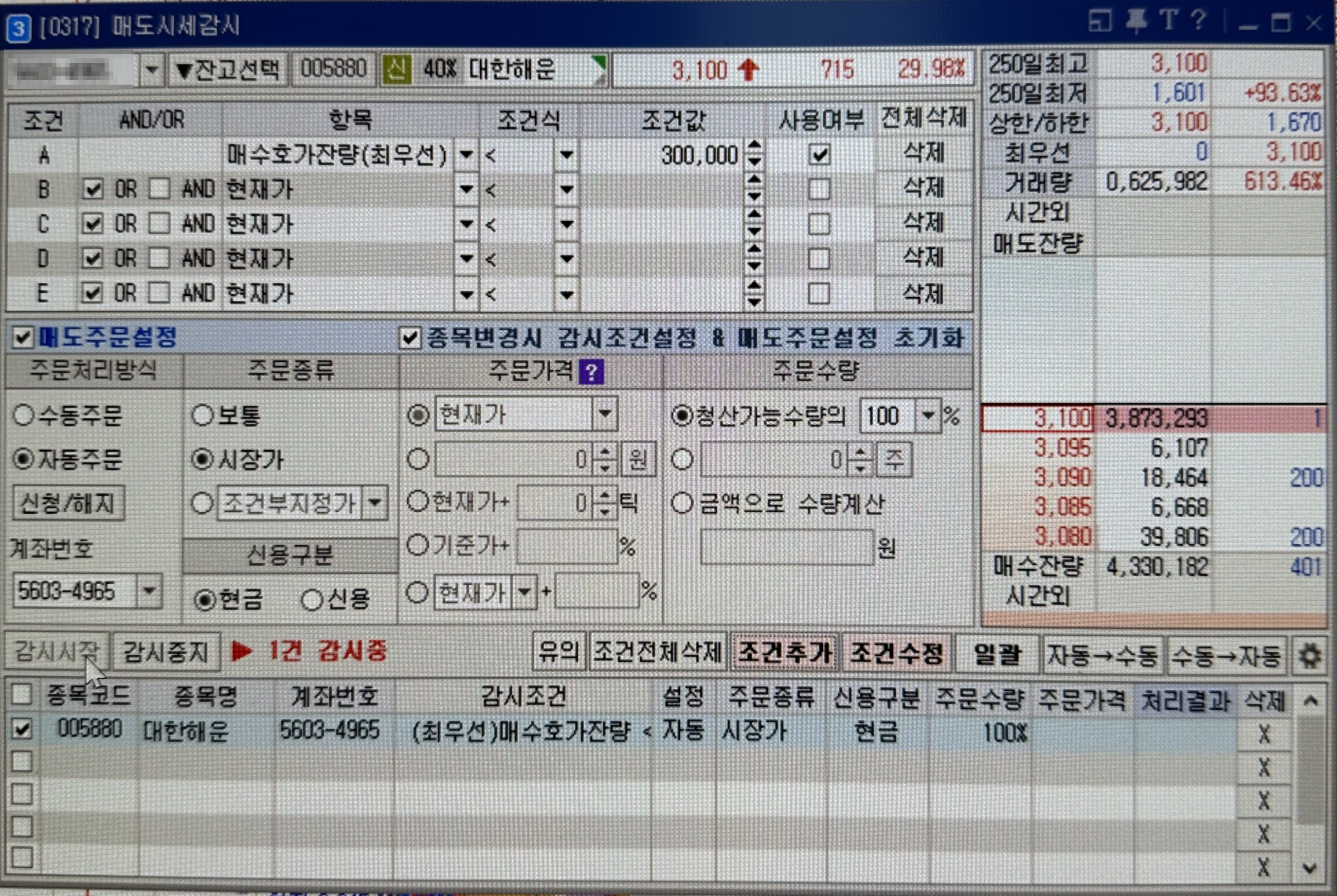 상에 진입할 때 상따를 했고 매도시세감시를 건 화면