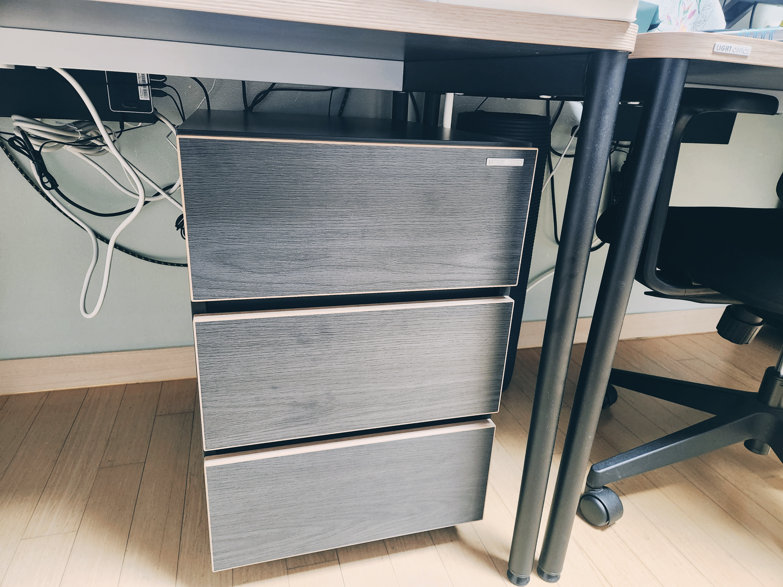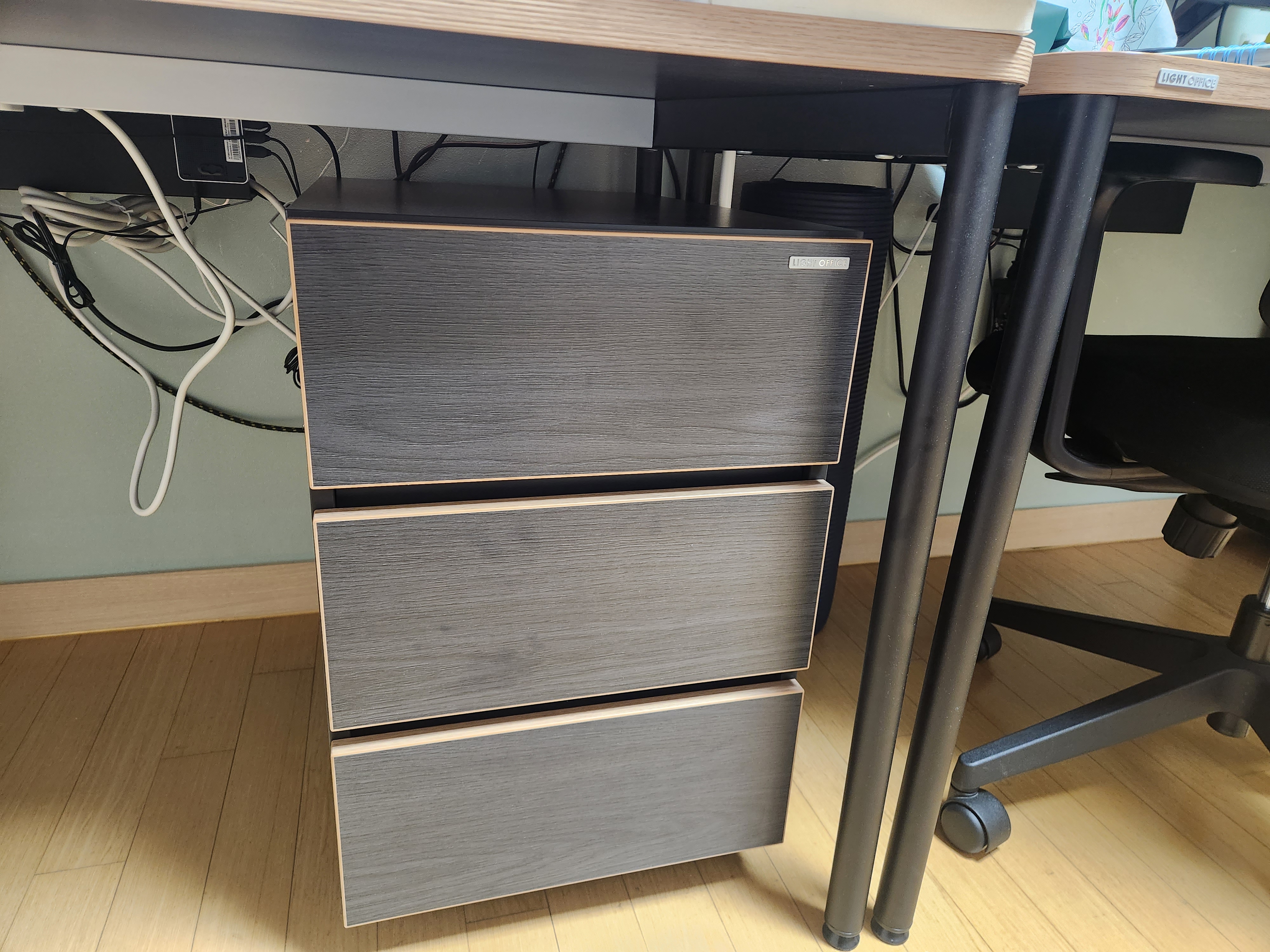 최종적으로 기존 서랍장에 물건들을 옮겨 담은 뒤 책상 아래 자리를 잡은 라이트오피스 3단 서랍장입니다.